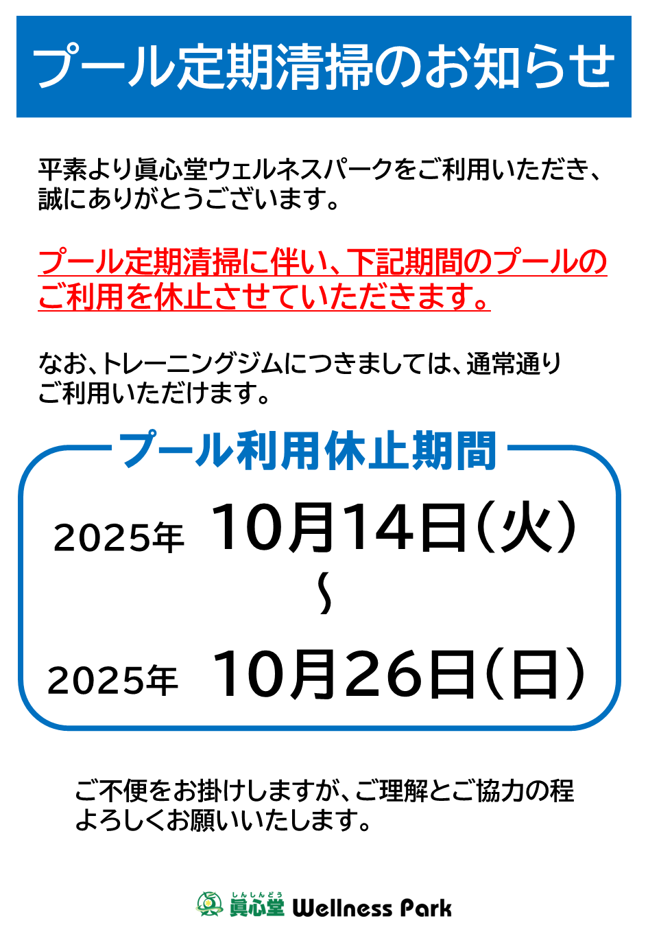 平素より眞心堂ウェルネスパークをご利用いただき、誠にありがとうございます。 プールの定期清掃に伴い、下記期間にてプールのご利用を休止させていただきます。 トレーニングジムにつきましては、通常通りご利用いただけます。 ご不便をお掛けしますが、ご理解とご協力の程よろしくお願いいたします。 【プール利用休止期間】 2025年10月14日(火)~2025年10月26日(日) また、ウェルネス会員様で休会をご希望のお客様は10月10日(金)までに、お電話またはフロントにて休会手続きをお済ませください。