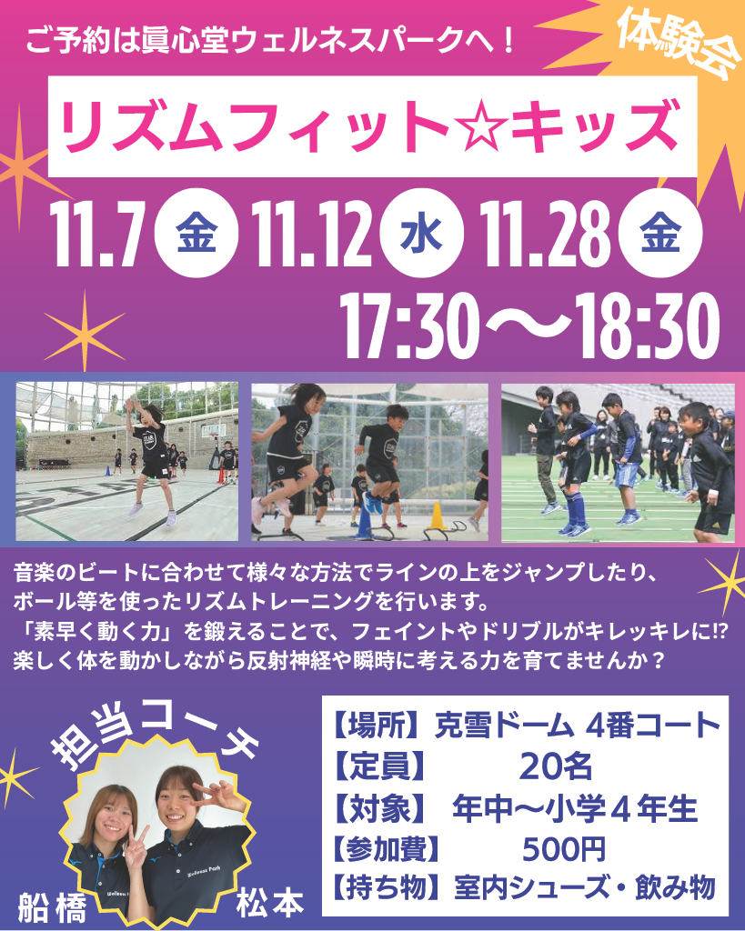 【日時】11月7日(金)、12日(水)、28日(金) 17:30~18:30 【場所】克雪ドーム 4番コート 【定員】20名 【対象】年中~小学4年生 【参加費】500円 【持ち物】室内シューズ・飲み物 音楽のビートに合わせて様々な方法でラインの上をジャンプしたり、ボールなどを使ったリズムトレーニングを行います。 「素早く動く力」を鍛えることで、フェイントやドリブルがキレッキレに!? 楽しく体を動かしながら反射神経や瞬時に考える力を育てませんか? TikTokにコーチが実際にチャレンジした動画もございますので、ぜひご確認ください。 ご予約好評受付中です! ご予約の際はお電話またはお近くのスタッフまでお申し付けください。 皆様のご参加お待ちしております。