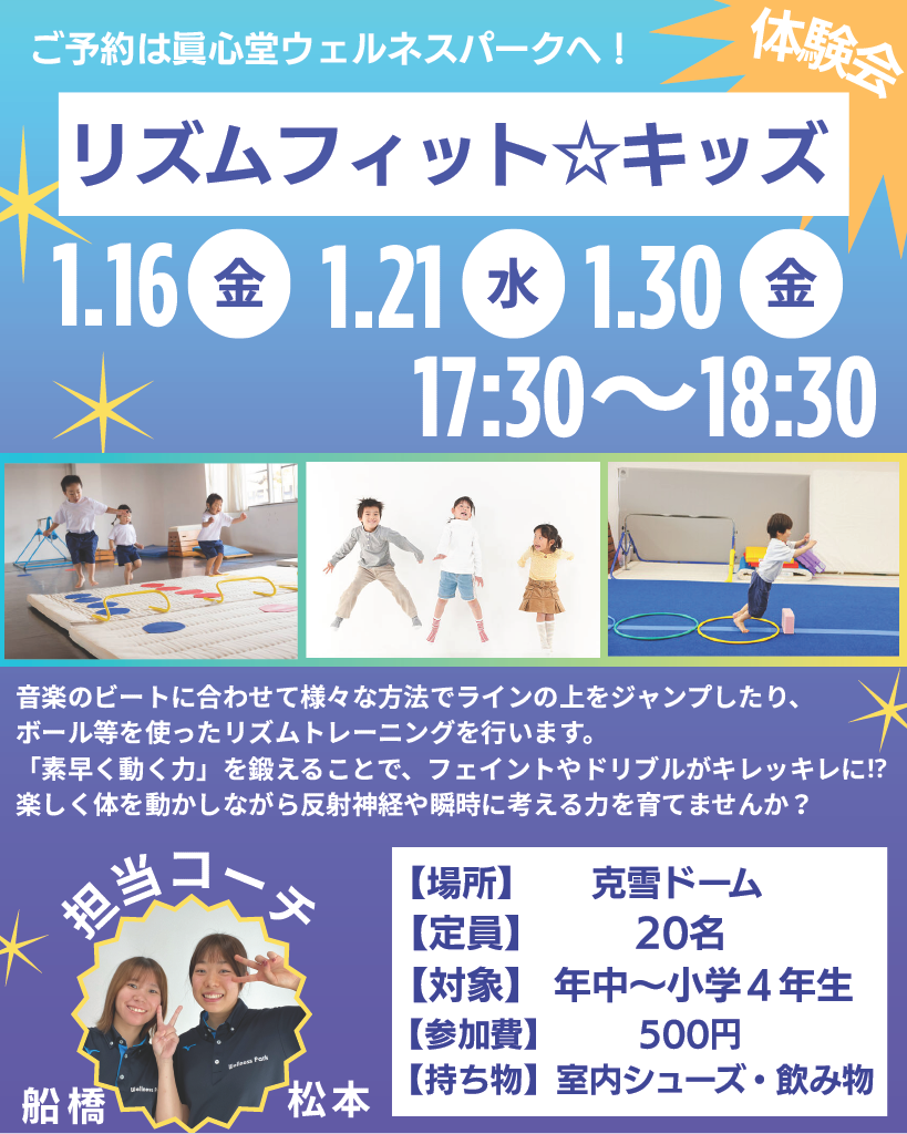 【日時】2026年1月16日(金)、21日(水)、30日(金) 17:30~18:30 【場所】克雪ドーム 【定員】20名 【対象】年中~小学4年生 【参加費】500円 【持ち物】室内シューズ・飲み物 音楽のビートに合わせて様々な方法でラインの上をジャンプしたり、ボールなどを使ったリズムトレーニングを行います。 「素早く動く力」を鍛えることで、フェイントやドリブルがキレッキレに!? 楽しく体を動かしながら反射神経や瞬時に考える力を育てませんか? TikTokにコーチが実際にチャレンジした動画もございますので、ぜひご確認ください。 ご予約好評受付中です! ご予約の際はお電話またはお近くのスタッフまでお申し付けください。 皆様のご参加お待ちしております。