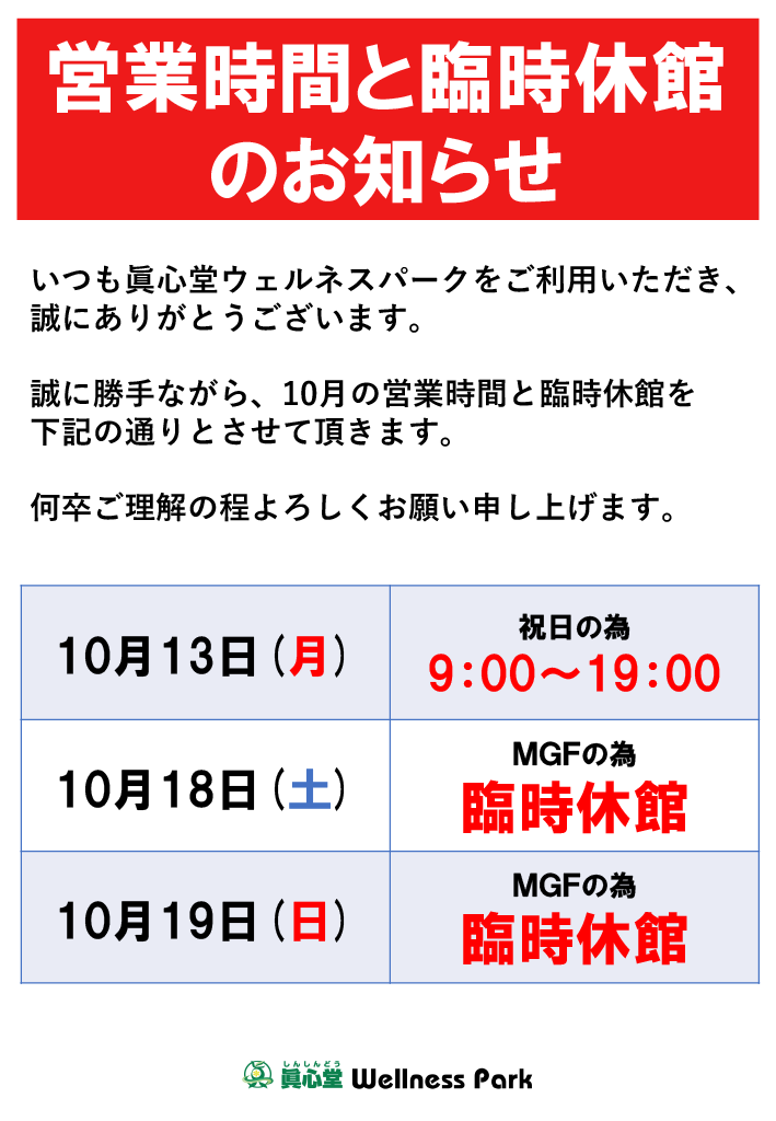 いつも眞心堂ウェルネスパークをご利用いただき、誠にありがとうございます。 誠に勝手ながら、10月の営業時間と臨時休館を下記の通りとさせていただきます。 何卒ご理解の程よろしくお願い申し上げます。 【日程】 ・10月13日(月) 祝日の為 9:00~19:00 営業 ・10月18日(土) MGFの為 臨時休館 ・10月19日(日) MGFの為 臨時休館
